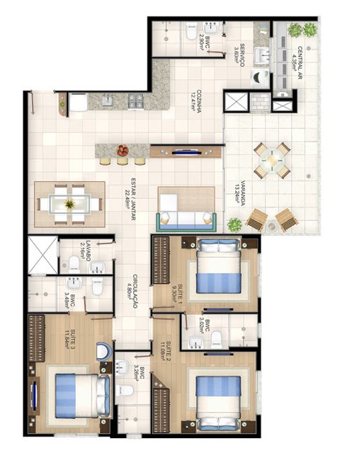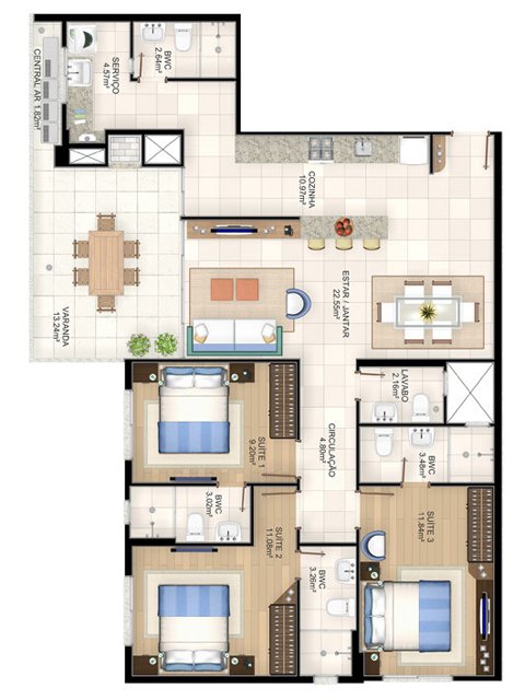 Apartamentos de 3 dormitórios (3 suítes) dispondo de ampla sacada com churrasqueira integrada à sala e cozinha. O edifício Campo Bello possui 12 andares com 2 elevadores, sendo 1 pavimento de garagem.